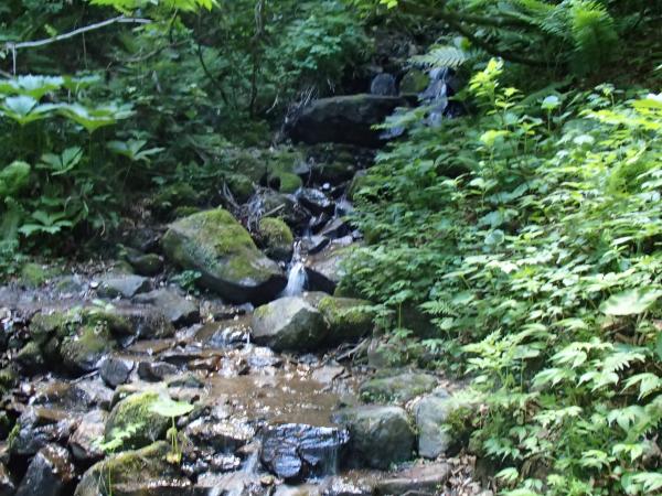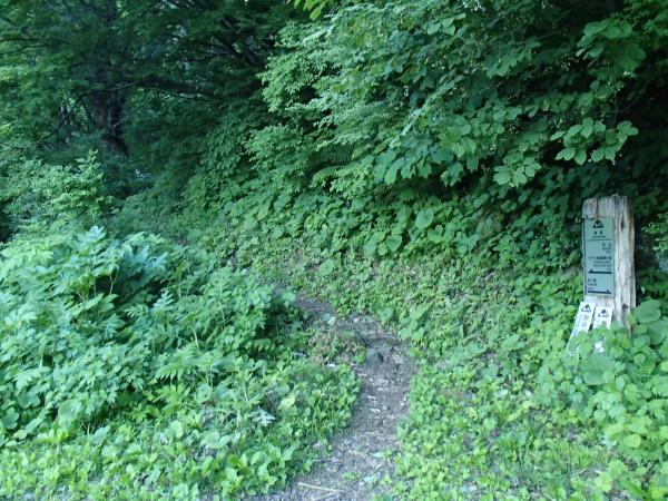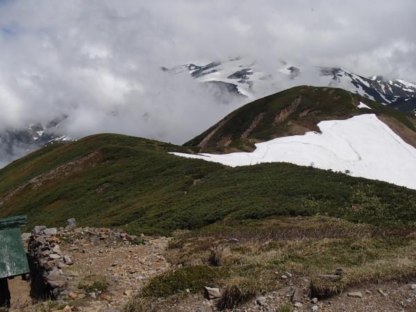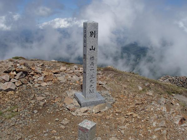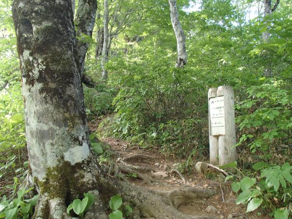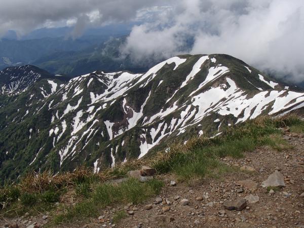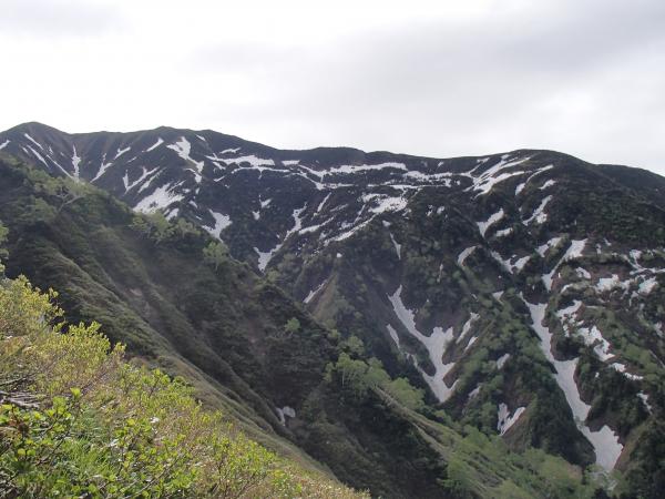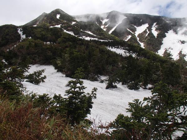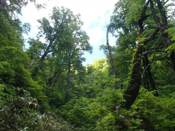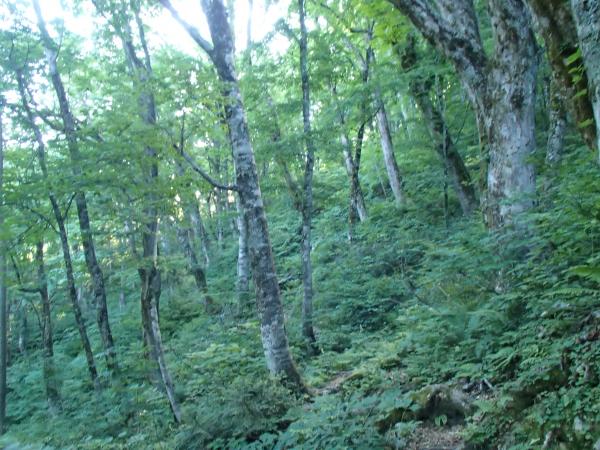 チブリ尾根の見事なブナ林の中を歩いていると本当にすがすがしい気持ちになると同時にブナの巨木に感動すら覚えます。そんな中黙々と高度を稼ぐ、笹が茂る1800m付近から展望が開ける別山、御舎利山、三ノ峰が現れる。チブリ尾根避難小屋手前から雪が夏道を覆っていました。小屋を過ぎ御舎利山に近づくにつれルートがわかりにくくなる。地図と夏道の記憶を頼りに直下の急登に辿り着く、なかなかの斜度です。登りより下りが大変な感じです。ここを突破してようやく御舎利山に到着。目指す別山の山頂が見える、振り返ると御前峰はガスがかかりつつある。天気予報通り午後から山沿いは雨の気配。先を急ぐ、別山山頂に到着後、休憩もほどほどに下山開始。順調に下るが思っていたよりも早くブナ林の中で雨につかまる、更に雨足は強くなり本降りに。やはり日頃の行ないの悪さですね。残雪期のルートファインディングは本当に勉強になります。