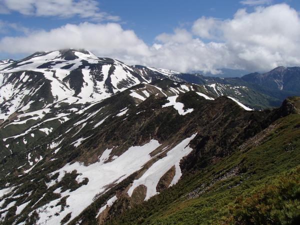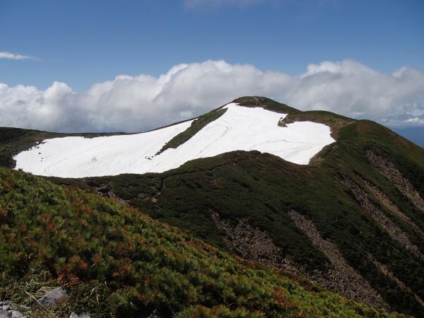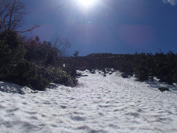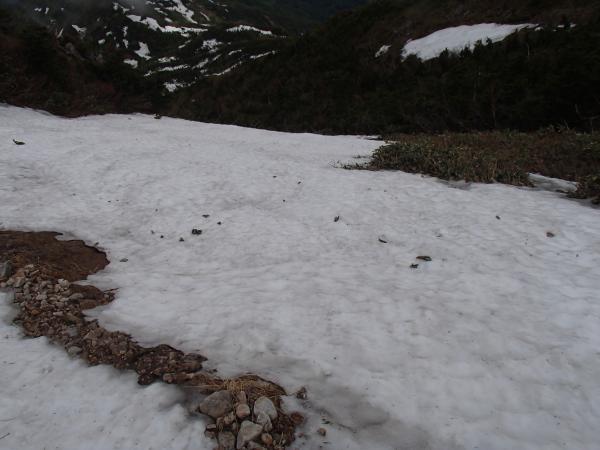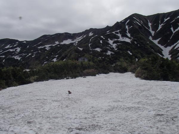 - ほとんど夏道が出ている、チブリ尾根避難小屋手前から雪渓が現れる。御舎利山直下の急登も雪に覆われているためルートと足元に注意が必要
