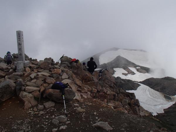 観光新道は殿ヶ池避難小屋手前1950m付近から2050mと蛇塚付近から黒ボコ岩手前に雪が残っています。弥陀ヶ原は五葉坂まで一面の雪、目印の赤旗が立てられていますがガスなど視界の悪い時は要注意です。室堂もセンターの周囲は雪が無く鳥居もすべて出ています、この日頂上はガスに包まれ視界はあまり良くありませんでしたが、7,8名の登山者が登頂されていました。