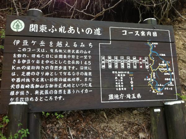 西吾野駅(45分)下久通(45分)542M付近(30分)670M付近(30分)伊豆ヶ岳山頂(20分)(関東ふれあいの道 五輪山(30分)正丸峠(60分)正丸駅