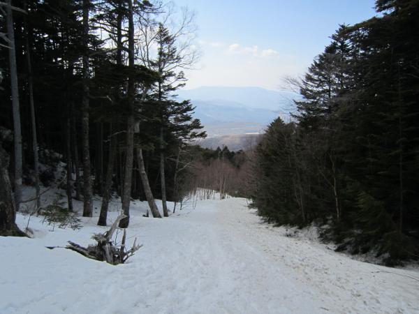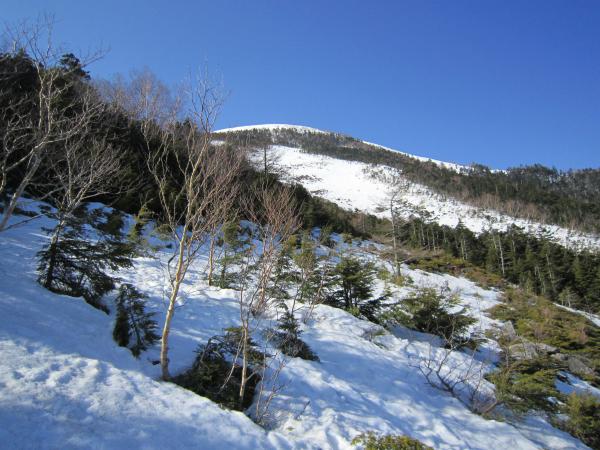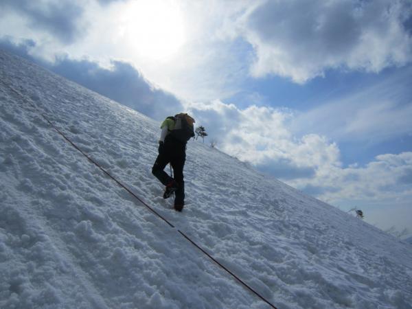 勾配がきつくなりアイゼン装着、雪を踏みしめて登っていくと、すれ違う下山者が雪を滑り台にして楽しそうに滑り降りていく姿を目撃。楽しそうにだけどお尻痛そう!