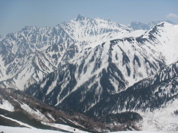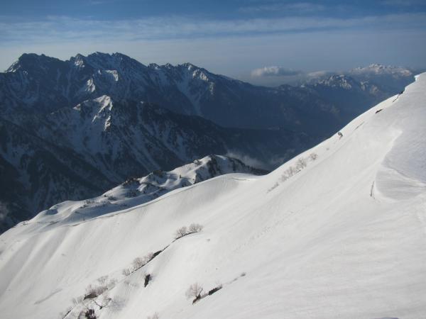 ■ 弓折岳から双六小屋 … 稜線上は雪庇とクレパスに注意します。トラバースでは深く身体が沈み込み、足が抜けなくなって時間をとられることもありました。