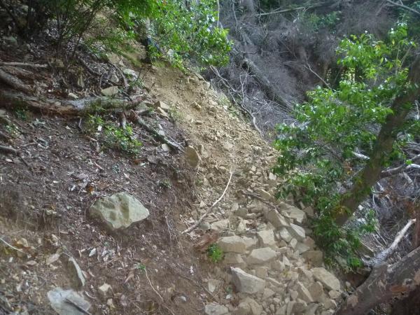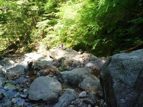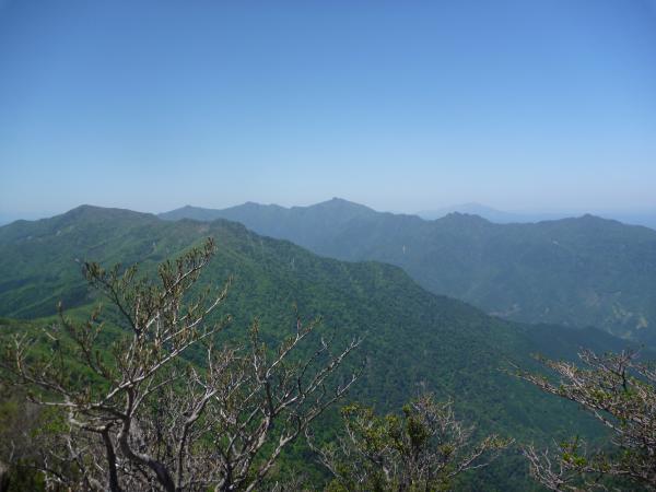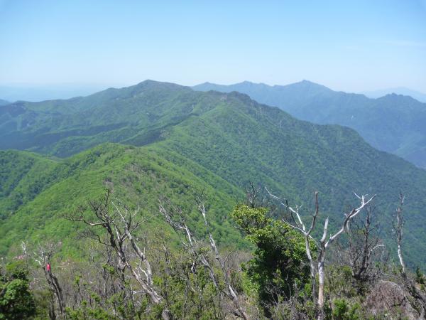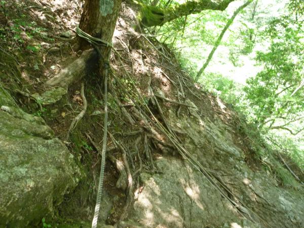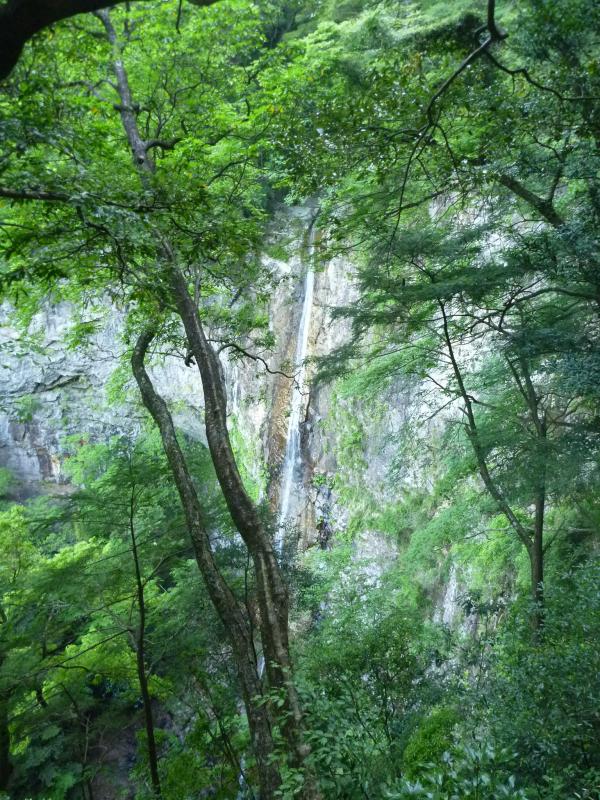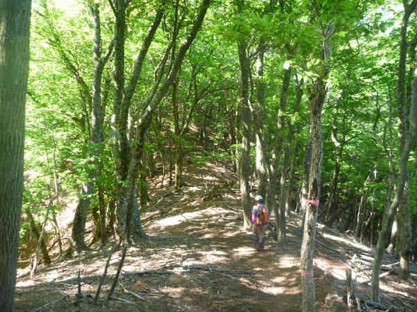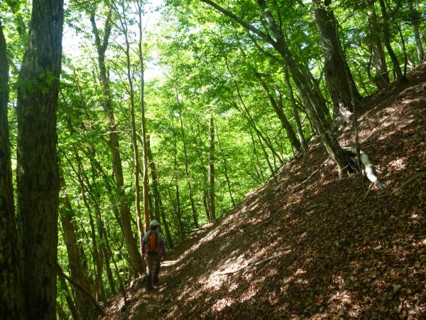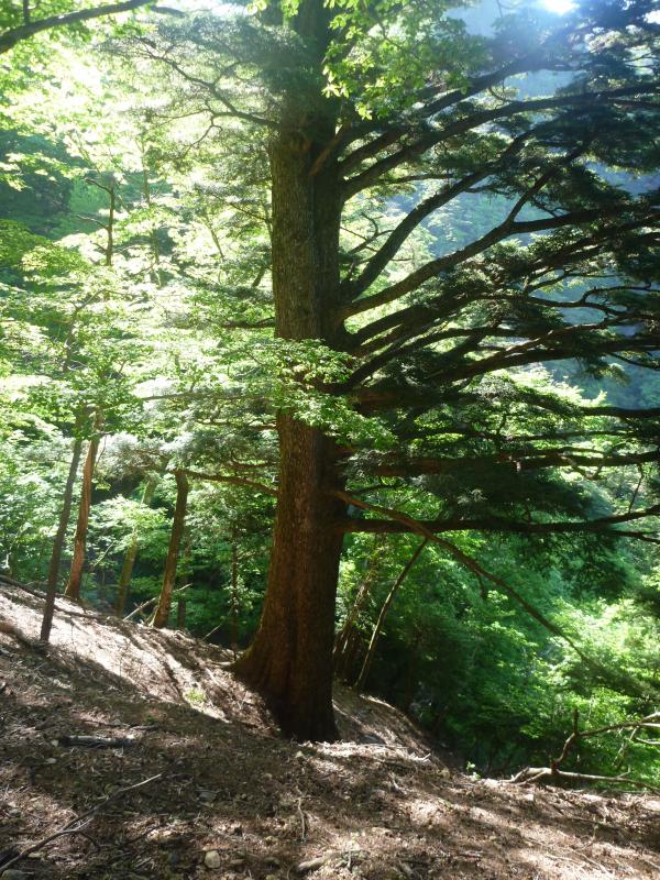 祖母山の後だからか普通の登山道なんだけど広く感じてしまう。観音滝を遠くから眺め、さらに登りつずけると一旦林道に出る。ここからだんだんと明るくなり多少崩れている箇所もあるが順調に登っていく。急勾配を登り切ると「三ツ尾分岐」に到着。ゼエーゼエーだ。