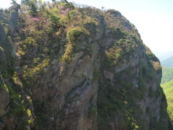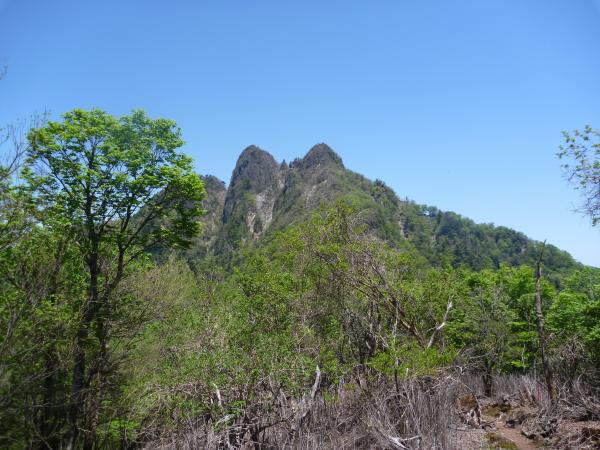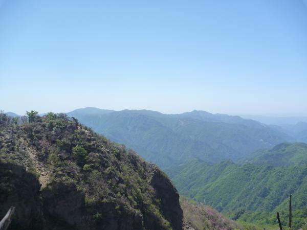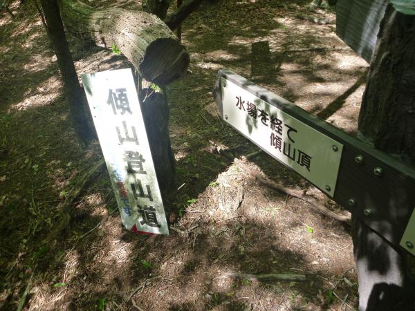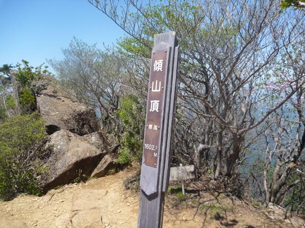 とても明るく道も緩やかで気持ちがいい。それにしても緑がとても鮮やかで目を奪われていると、坊主尾根と一般ルートの分岐に着く。今回は一般ルートを選択。 ロープ箇所はゆっくり上がり、そのあとは赤テープをしっかり確認をしながら登ると「五葉塚」だ。目の前に傾山がドンと視界にはいるが、ここで下りになる。木に“キケン 立入禁止”の黄色いテープが巻き付けられているところを進まないように注意。崩れています。なので、迂回します。そして“あと10m”道標を過ぎればようやく「傾山山頂」に到着。