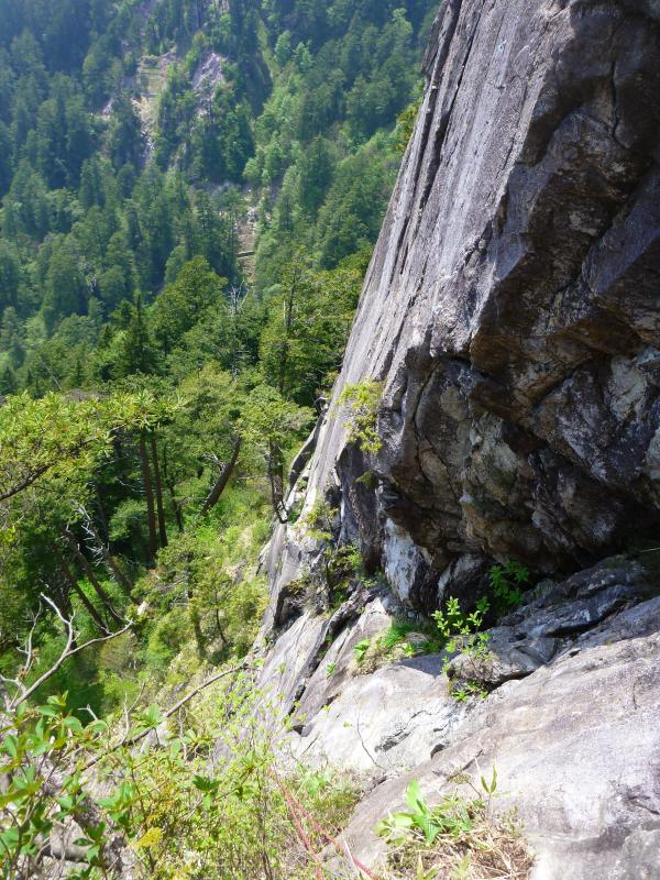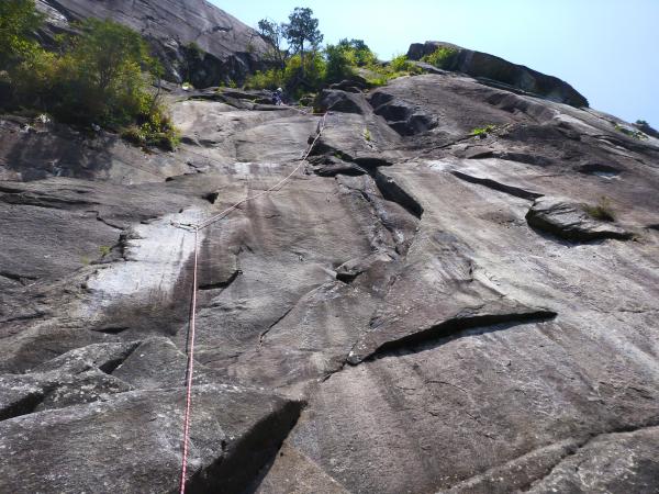 【不動岩】 中間支点・終了点ともに新しくしっかりしたものが多かった。一部クラックが土で埋まっている所(これより木曽路の1P目)があった。山男純情の1P目も何故か濡れていた。