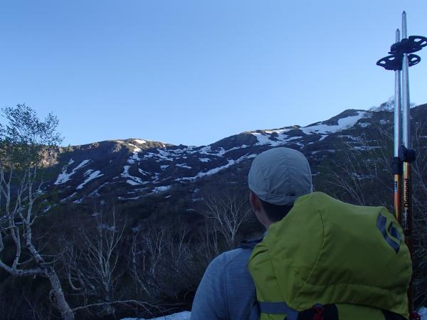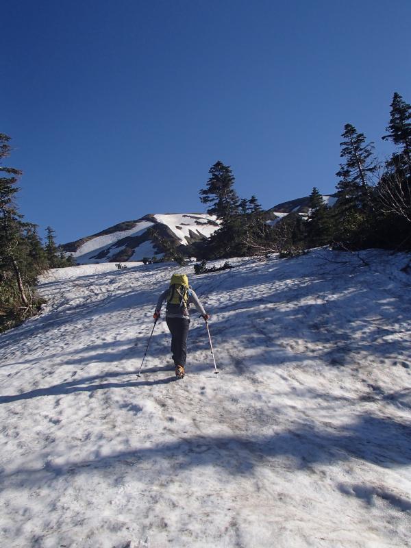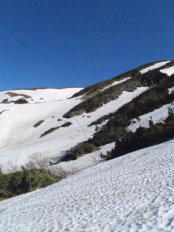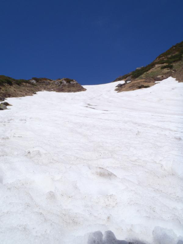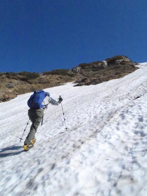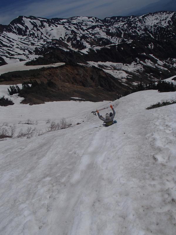 甚之助上部の斜面は格好の尻セードゾーン。ザックをソリ代わりに一気に下れます。