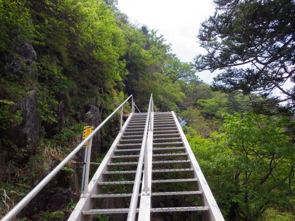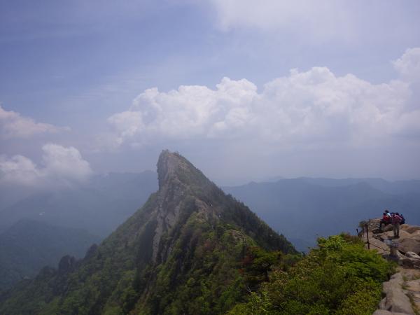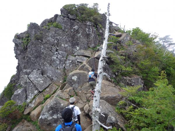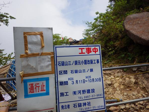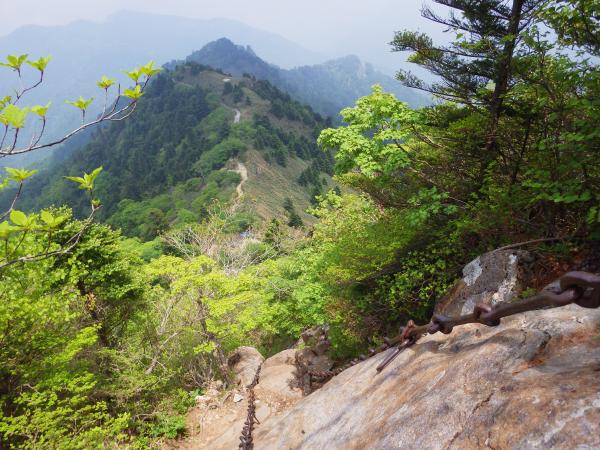 石鎚山周辺は登山者が多く道もよく、また鎖場もまめに点検され、このときは小屋と鎖場の工事が行われており、三の鎖は使用できませんでした。石鎚山頂~天狗岳(西日本最高峰1982m)は距離は短いですが、足のすくむ高度感のある岩稜帯です。左右(南北)どちらに落ちても助からない危険個所です。特に北東側は100m以上の断崖絶壁です。