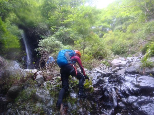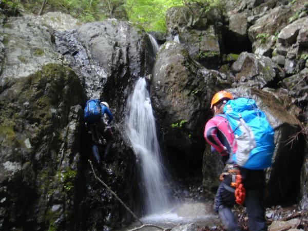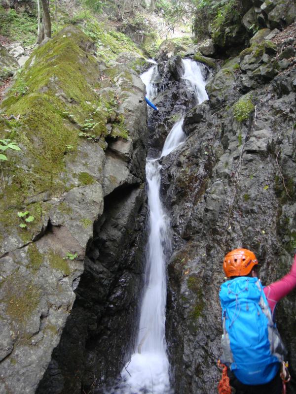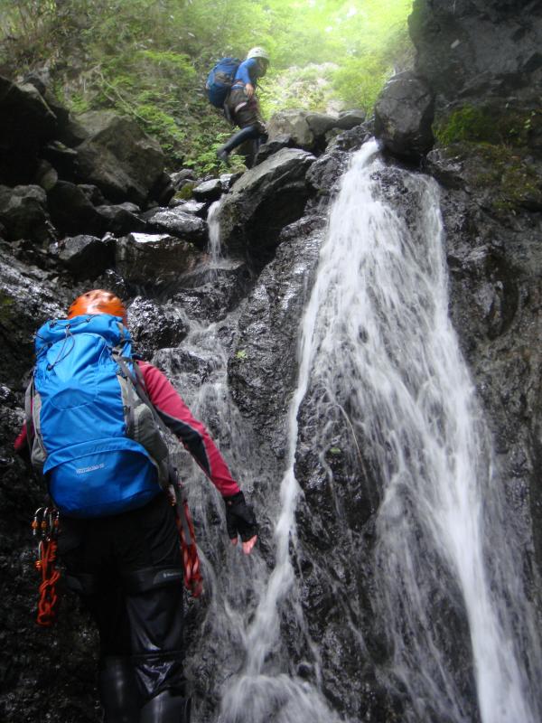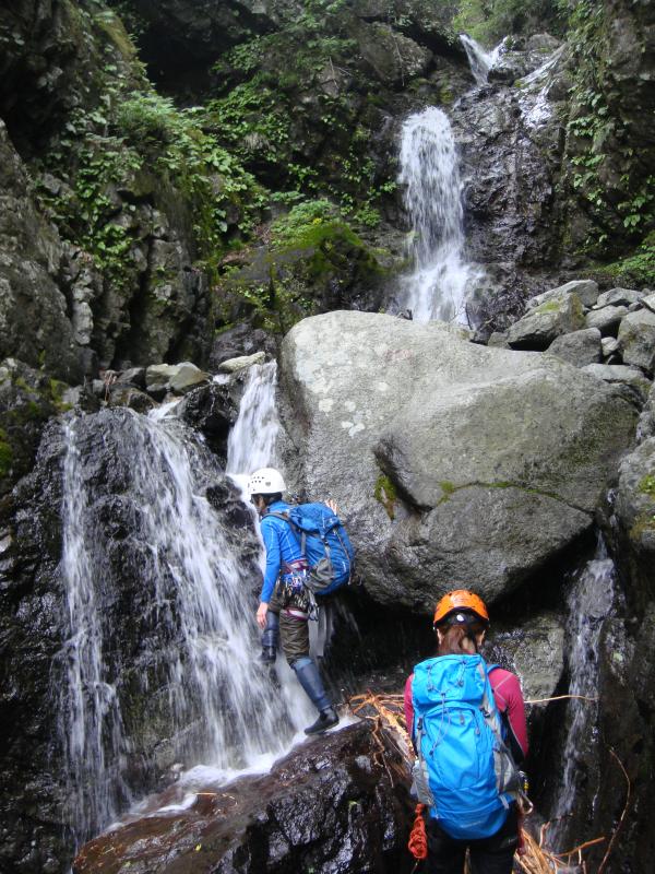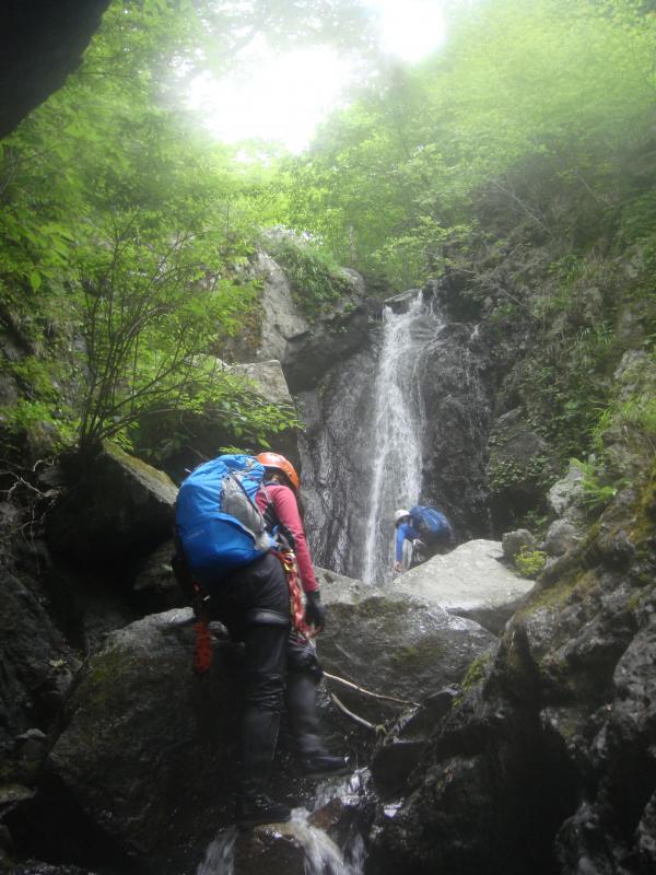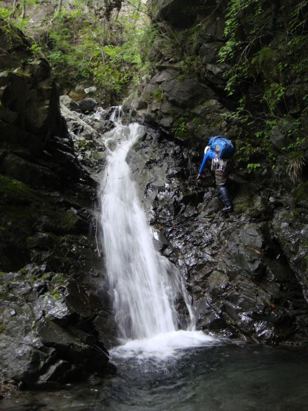 - 戸沢山荘(30分)水無川本谷F1(75分)セドノ沢左俣大滝(120分)稜線(65分)戸沢山荘
