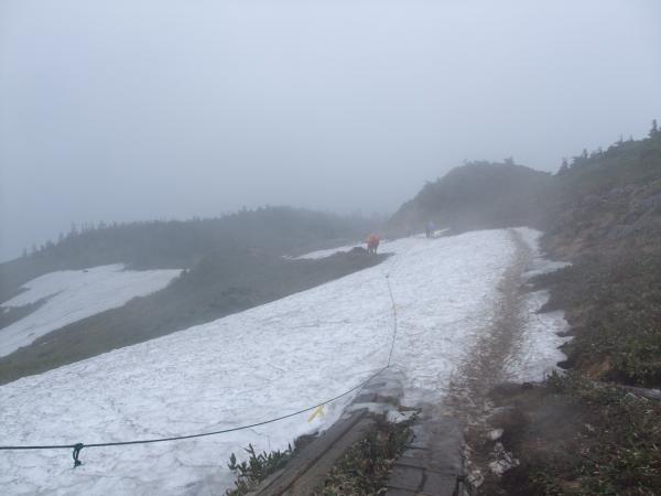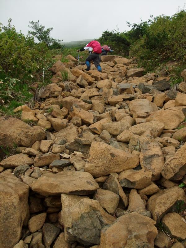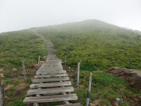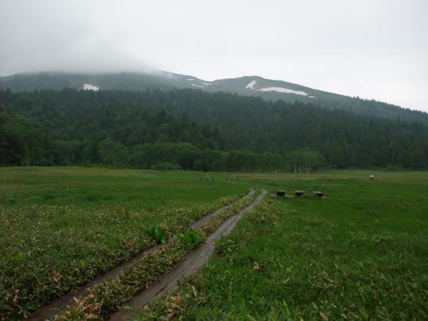 至仏山は7月1日に登山が解禁されたばかりです。新宿から夜行バスで戸倉へ。戸倉から始発のバス(4:40発)に乗って鳩待峠へ。登山の準備をしていると雨が降ってきました。「出発から雨具着て歩く登山は久しぶりだな」と思いつつ、登山開始。山ノ鼻でトイレに立ち寄り、至仏山の登山口へ。はじめは細い道の急坂です。樹林が多少は雨を防いでくれます。
