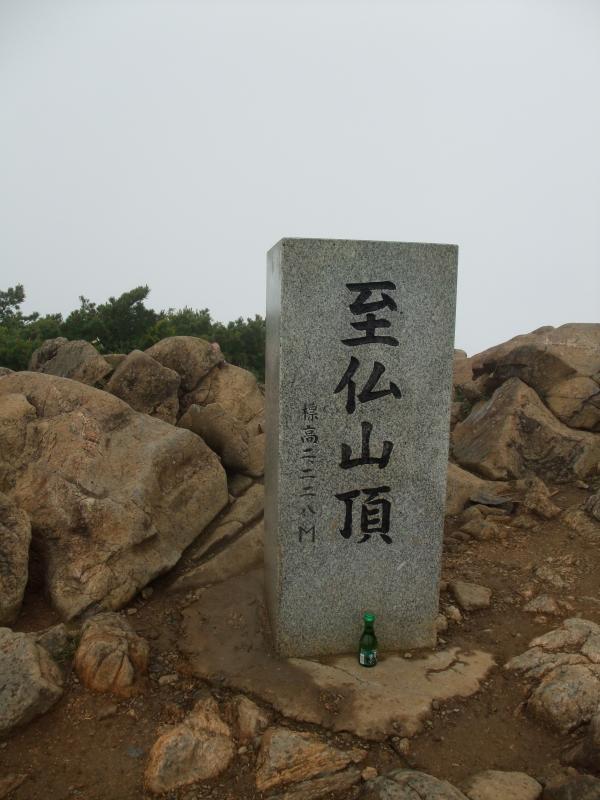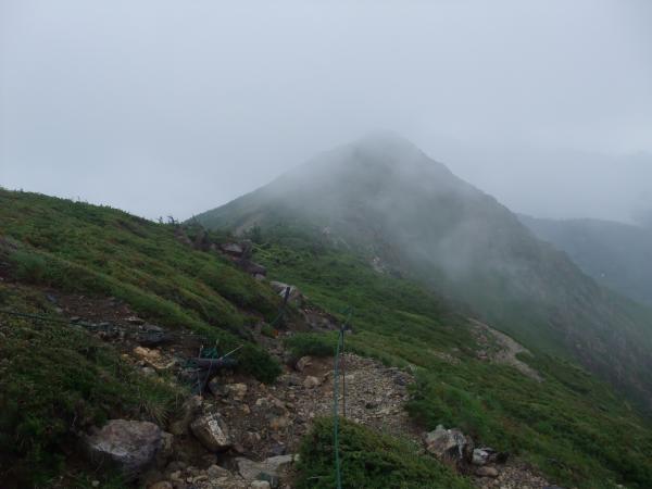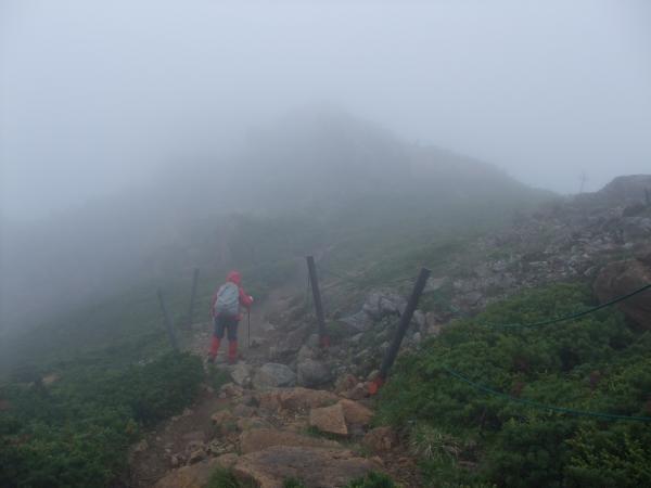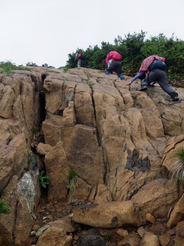 山頂での休憩中は雨降らず。小至仏山へ向かうと、雨と風が強くなってきました。横なぐりの雨です。しかも、濡れた蛇紋岩がツルツルとよく滑る・・・。山頂から小至仏山までは蛇紋岩が密集しているので要注意です。