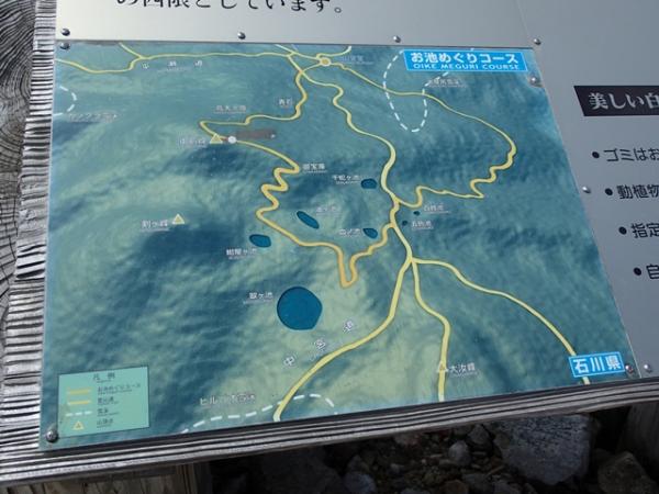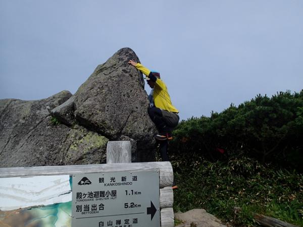 - 別当出合P(8分)別当出合(29分)中飯場(52分)甚之助避難小屋(15分)南竜ヶ馬場との分岐(32分)黒ボコ岩(7分)エコーラインとの分岐(12分)室堂(36分)御前峰(32分)千蛇ヶ池分岐(18分)大汝峰(12分)千蛇ヶ池分岐(27分)室堂(11分)エコーラインとの分岐(7分)黒ボコ岩(65分)仙人窟(15分)別当坂分岐(51分)別当出合(7分)別当出合P