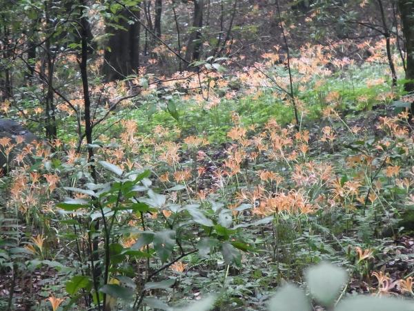経ヶ岳から多良岳のコースを歩きました。黒木登山口からスタート。つげ尾まで急斜面を一気に上がります。この区間はガレ場の急斜面で足元が悪く、アブに悩まされました。経ヶ岳山頂は風がとても涼しくのんびり過ごせます。この日はあいにくの曇りで、展望はありませんでした。山頂から急斜面を下り、長い岩場の道を歩きます。不安定な個所もありので慎重に歩きましょう。金泉寺で休憩した後、多良岳へ。こちらは木々の隙間からかすかに展望がのぞめます。下山途中に、オオキツネノカミソリの群生地を通ります。かなり広い範囲に咲いており、見ごたえがあります。
