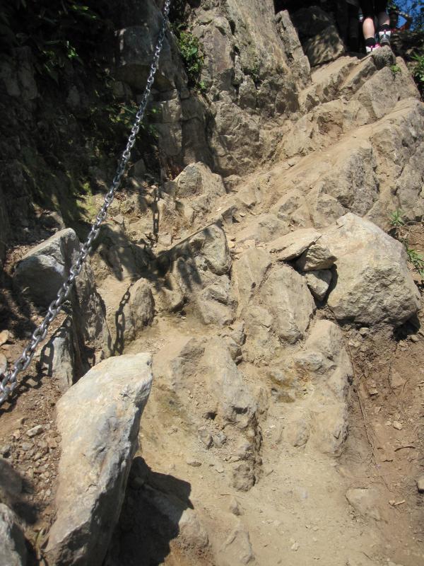 鎖のある岩場もあり初心者コースにしては色々楽しめるので、老若男女問わずファミリーもいたり、多くの人で賑わっていました。ちょっと渋滞気味です。岩場の経験がほぼないので、クライミングの基本を知っていればもっと楽に降りられるなあと思いました。ストックは状況によって使い分けると上り下りが楽です。岩が日差しで熱くなっているので、手袋もあった方が良いと思います。