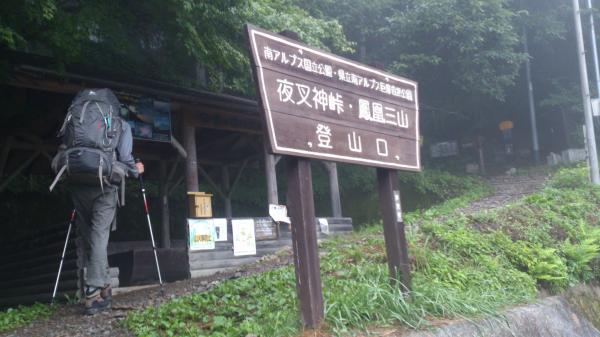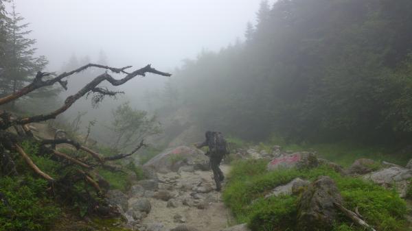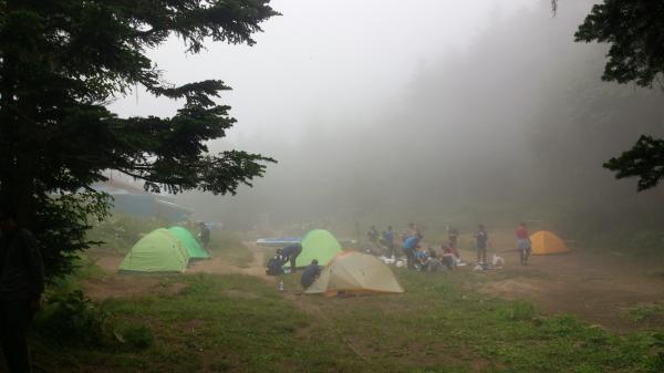 前日に甲府駅ロータリー付近で仮眠を取り、午前4:30のバスで夜叉神峠入口まで。広河原方面へ行かれる登山者の方々も多くバスも臨時便が出ておりました。夜叉神峠入口前に駐車スペースありますが、市営芦安駐車場の方が広いと思われます。天気が曇っており夜叉神峠入口を午前6時に出発、比較的緩やかな登りと長い距離が続きますが山道は歩きやすいです。南御室小屋の幕場はとても広く、この日は5~6人用のテントが5張と2~3人用が3張、1人用が3張りほどありましたがそれでも幕場の半分が埋まっていないくらいでした。