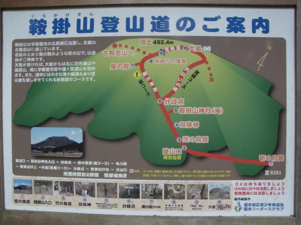 - 登山口駐車場(15分)鞍掛山神社(40分)奥の院(5分)鞍掛山山頂