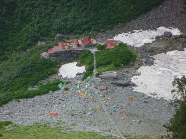 - 涸沢の小屋周辺の雪渓にも多くの残雪があり、パノラマコースは通行禁止になっています。