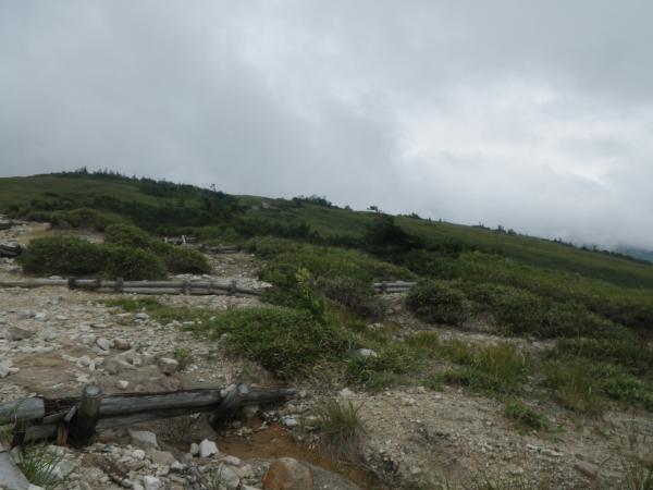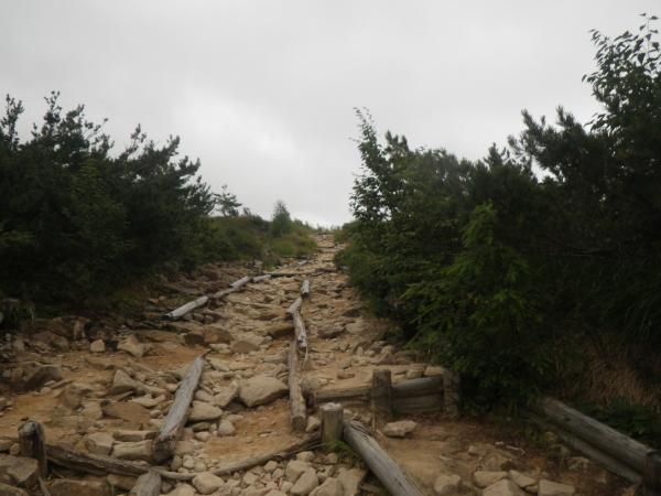 - 雨の影響で登山道は滝のよう。