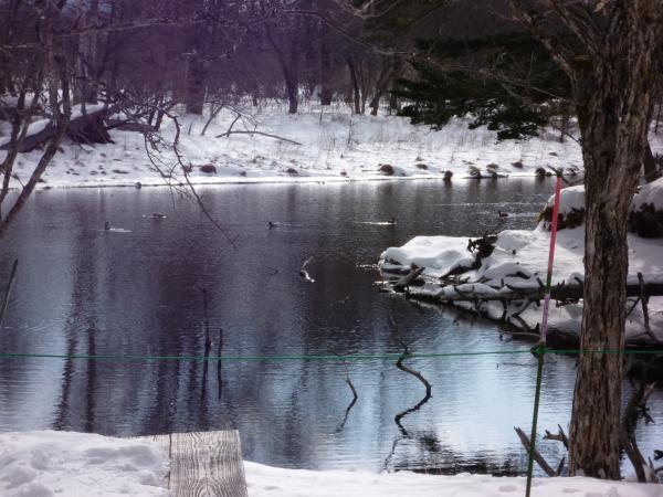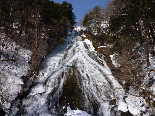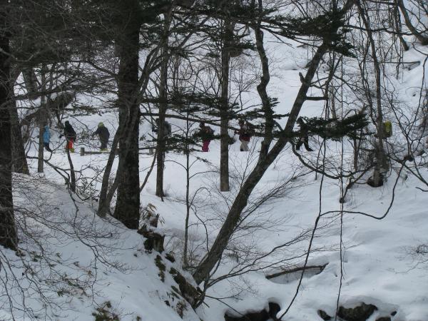 - 数日前からの晴天&高温で雪は溶け気味でした(*_*)。しかし、危険箇所もほとんど無く快適です♪ただし、湯滝から戦場ヶ原への道は夏道の湯川沿いも歩けますし、トレースも付いていますが、木道の隙間を踏み抜くことと、バランスを崩した場合右側の湯川へ転落する危険性があるため、湯川西側の樹林帯を歩きました。なお湯川は水深は浅いので溺れる危険はほとんどありません(^_^)v。