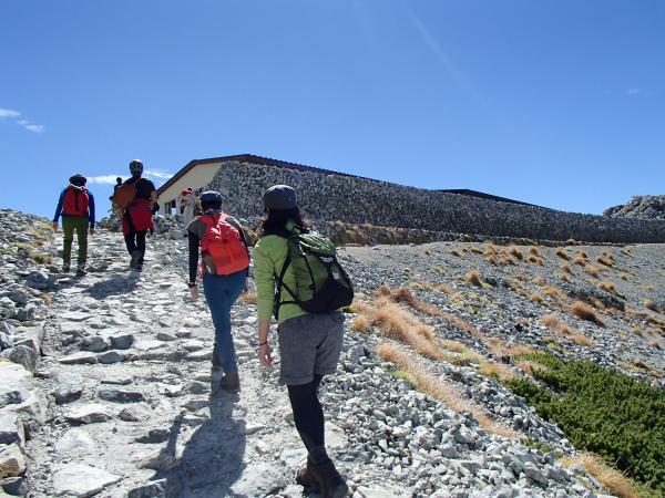 - 一ノ越山荘までは、しっかりと整備された石畳のような道で歩きやすいですが、一ノ越山荘から頂上までは大きな石や岩がごろごろしていて傾斜もきつくなります。