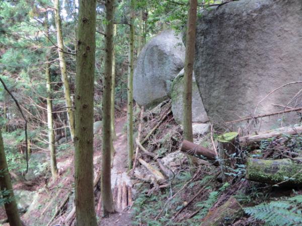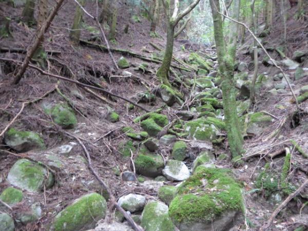 宇土浦越からの下りで2度目の沢を渡り終えたらそのまま沢沿いを下りましょう。真っすぐ斜面に進むと作業林道のような道があり、そちらにもピンクの目印があるため、分かりづらいです。
