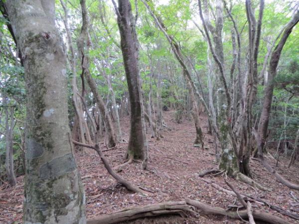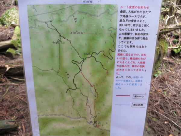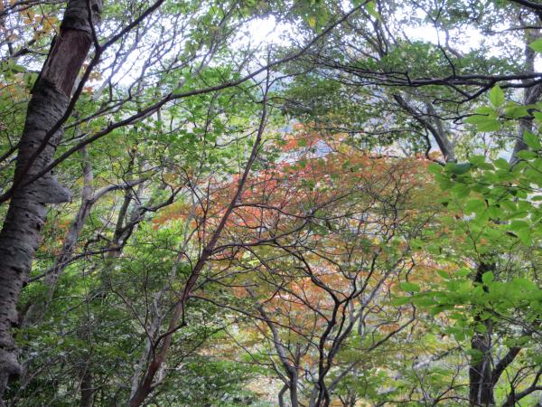 - 途中の分岐より、ブナ尾根コースを使用してみました。しばらく進むと踏み跡が分かりにくくなり、赤いテープを辿っていくと、どうやら廃止区間の谷沿いを歩いてしまったようです。谷を詰めて高度をあげていきましたが、尾根に出るまでは、崩落しやすい道が続き緊張しました。