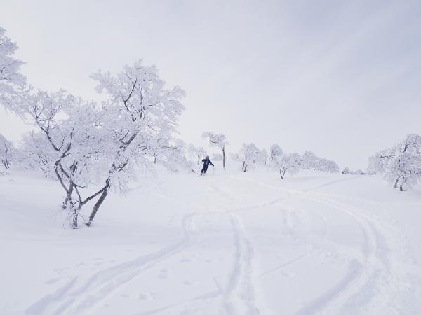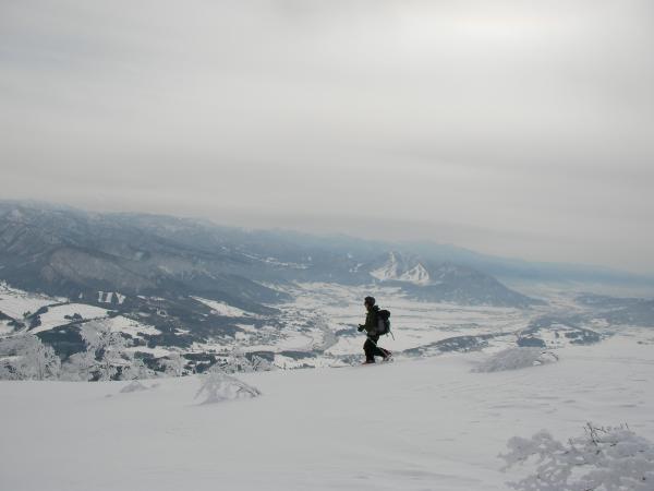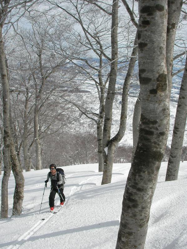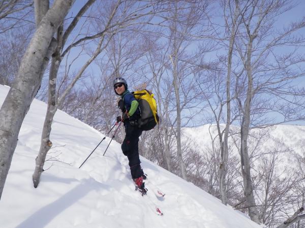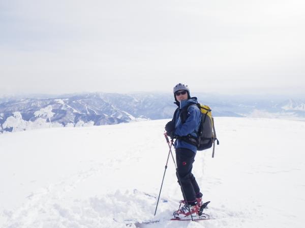 - 天候がよく、気温も高めでやや雪が重かったです。山頂付近と北斜面は軽いパウダーでした。ラッセルはスキー板を履いて、膝下まで沈む感じでした。