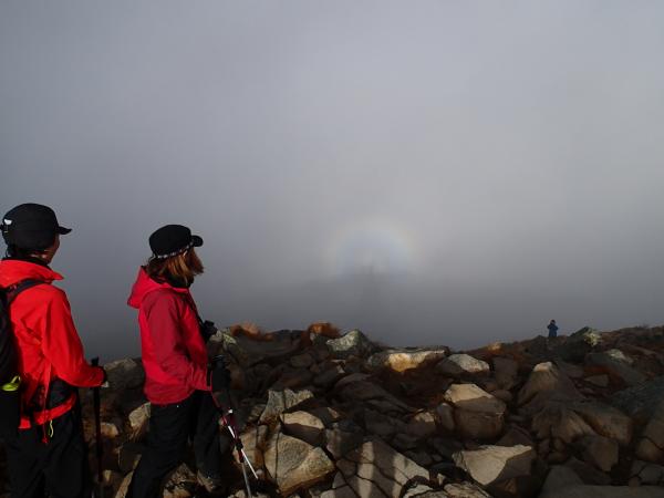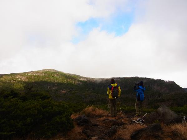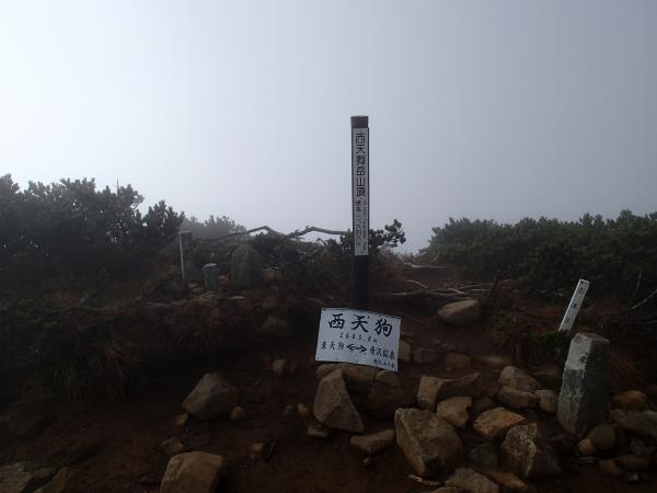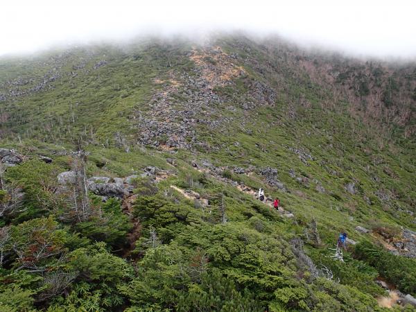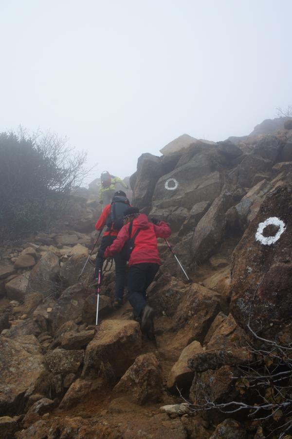 高見石小屋よりダラダラと1時間ちょい登りますと展望台。ガスにより何も見えず・・・ここ辺りからウィンドブレーカーが活躍してきます。