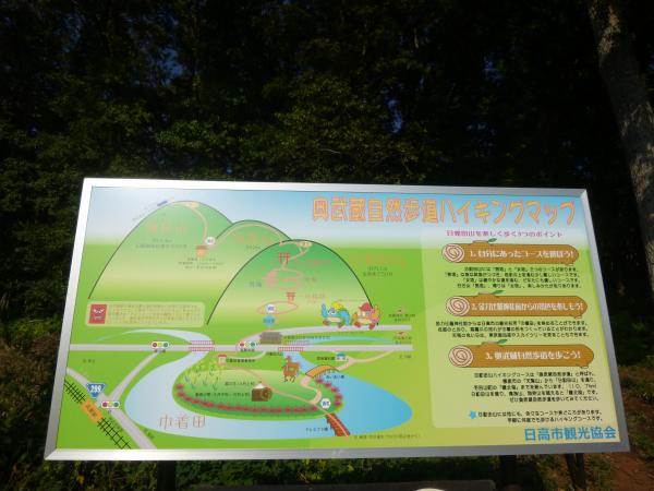 - ○高麗駅からしばらくは車道歩きです。看板に従って曲がり、ハイキングコース入口に着くとそこに案内図があります。ここを登ってすぐの所に公衆トイレ、ベンチがあります。