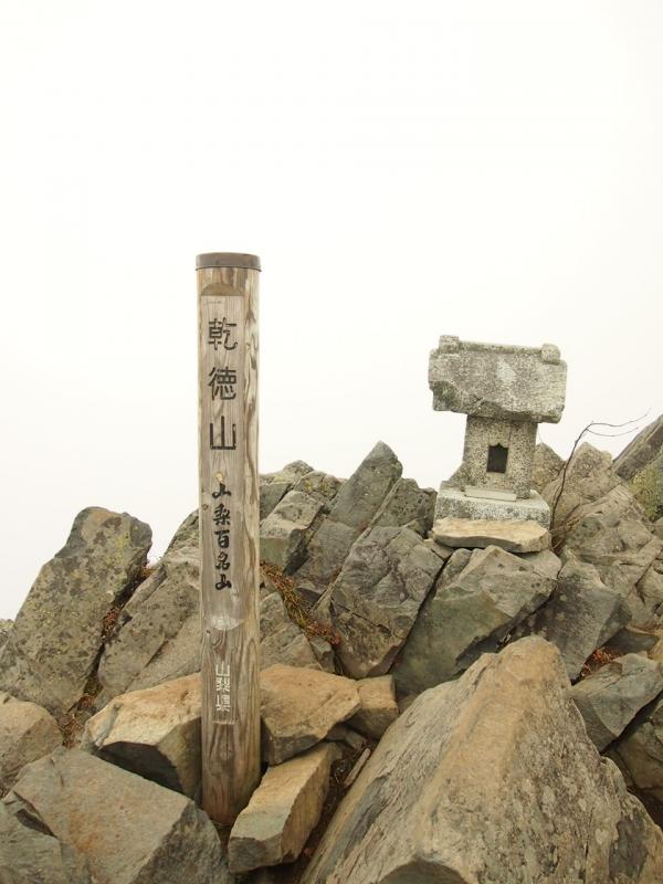 - 乾徳山登山口バス停→(35分)→登山口→(60分)→錦晶水→(25分)→月見岩→(45分)→乾徳山→(35分)→扇平→(道満尾根利用80分)→徳和峠→(10分)→乾徳山登山口バス停
