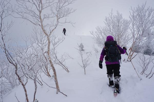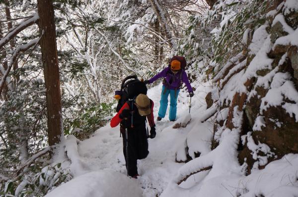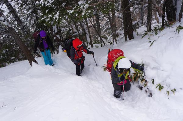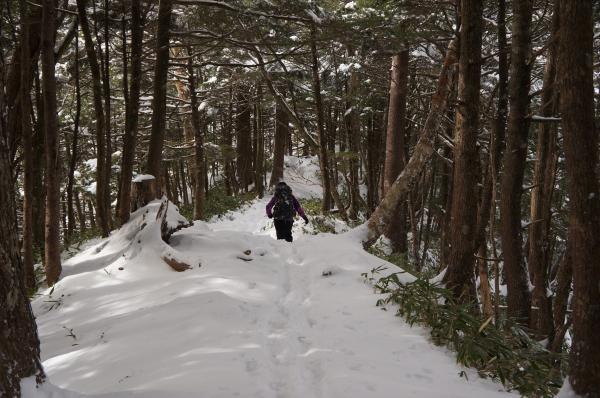 尾根上は積雪も深く、すっかり冬道です。一部ルートの狭い個所もあるので、滑落しないよう気を付けてください。