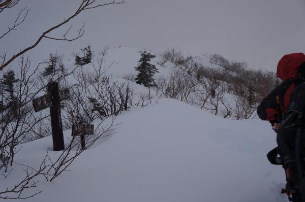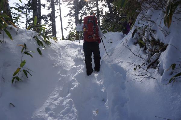 尾根上はトレースを外すと膝や太ももまで埋まるほどの雪でした。