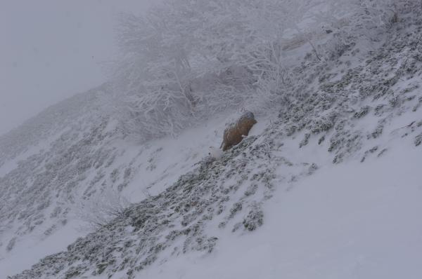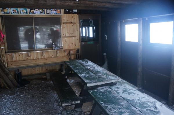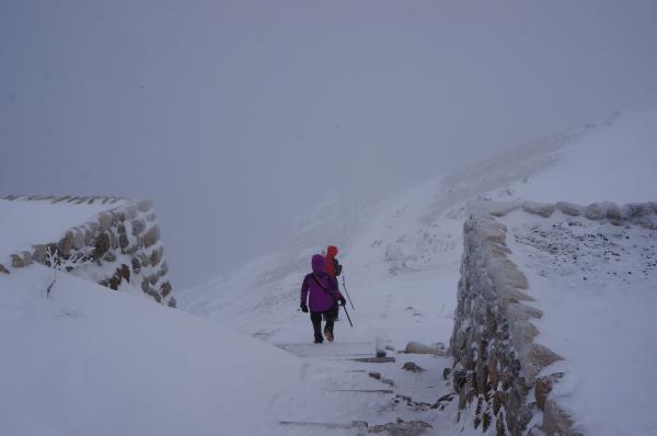 登り始めはウール+ベストでちょうどいい気温でしたが、第二ベンチあたりから雪も舞い気温が下がってきました。ソフトシェルや尾根上ではフリース+ハードシェル、風もあったのでネックウォーマーやバラクラバが役立ちました。