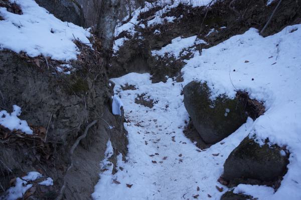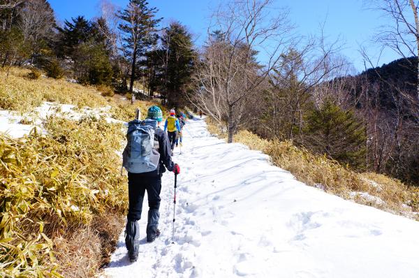場所によっては雪もなく、あっても深い雪ではないため、軽アイゼンでも可。ストックも利用するのがバランスもとれるのでおすすめです。(この2週間で積雪量がかわっているようです。軽装備は禁物です。)