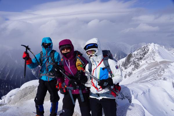 槍ヶ岳方面から真っ黒な雲が湧き上がっていたので、その雲が来る前に何とか下山したいところ。無事に山頂に着くことが出来ました。稜線上はカリカリに凍ってはいましたが、それほど危険な個所はありませんでした。