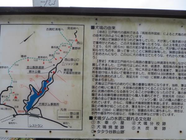 - JR九州バス犬鳴口バス停(12分)犬鳴山登山口(13分)藤七谷ルートとの分岐(25分)犬鳴山山頂(30分)猪野越(40分)椿峠(5分)鹿見岐(15分)番兵跡(30分)薦野峠(12分)西山山頂(8分)薦野峠(40分)犬鳴川源流登山口(35分)犬鳴ダム(10分)JR九州バス犬鳴口バス停 *歩行時間のみ