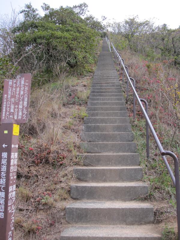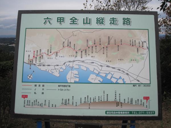 - 須磨浦公園駅→(30分)→鉢伏山→(5分)→旗振山→(14分)→鉄拐山→(20分)→おらが山→(17分)→400階段→(12分)→栂尾山→(15分)→横尾山→(14分)→馬ノ背→(10分)→東山→(26分)→妙法寺→(39分)→荒熊神社→(10分)→高取山→(55分)→鵯越駅→(80分)→菊水山→(53分)→鍋蓋山→(24分)→大龍寺→(16分)→市が原→(54分)→新神戸駅