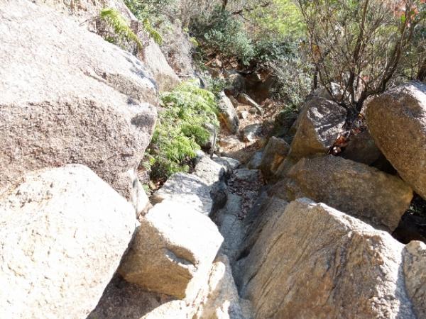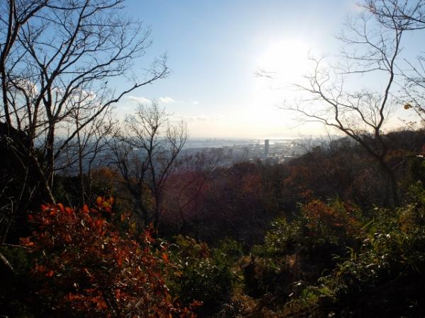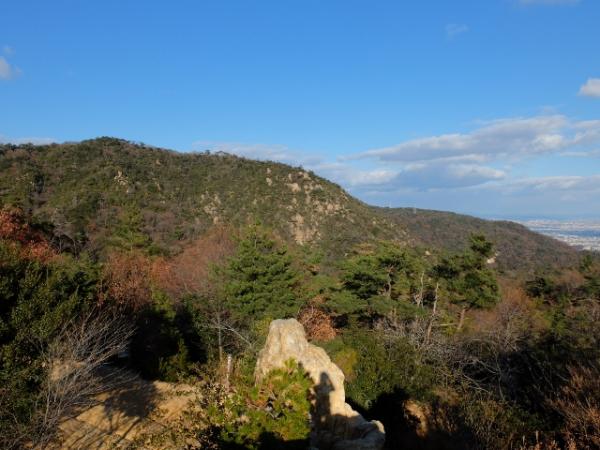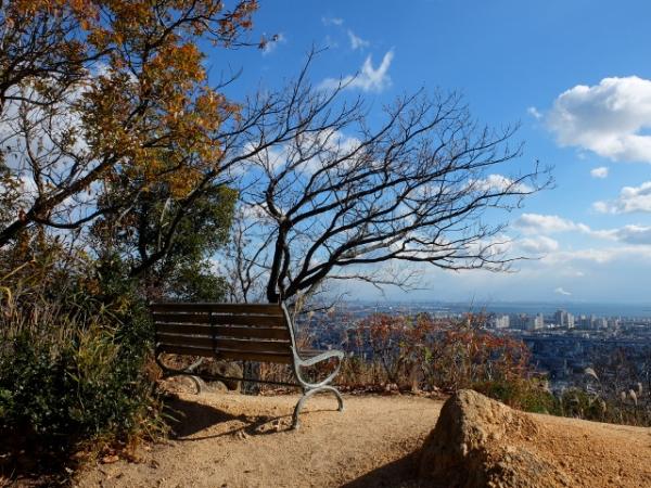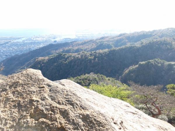 芦屋川駅から住宅街をねけ、樹林帯の森を少し歩くとすぐに岩が出てきます。荒地山名物の岩梯子を3点支持で落ち着いて登り、ふりかえると晴天の空の下に神戸の市街地が広がっていました。