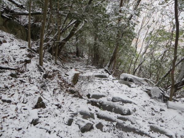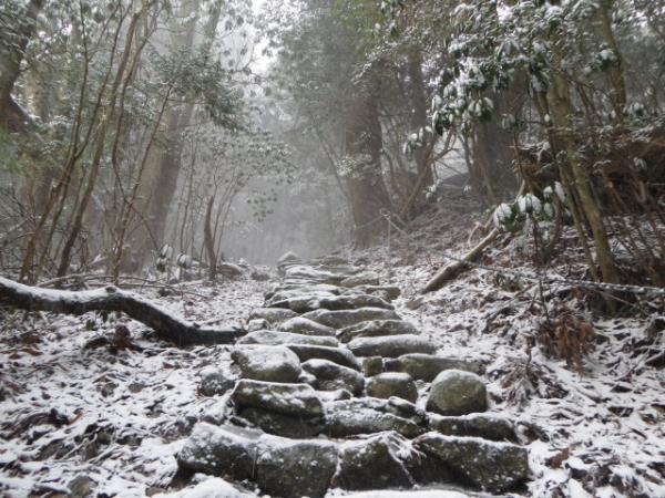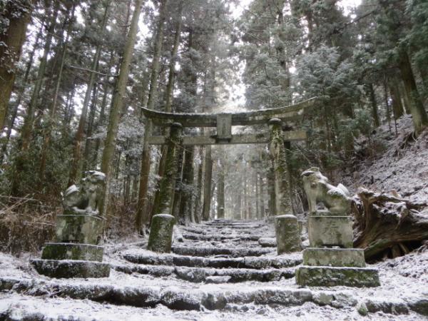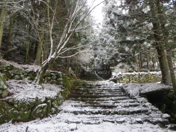 - 寒波の影響で標高500m以上は積雪があり、石段の参道や鬼の石段は滑りやすい状況でした。今回は、アイゼンを使用しませんでしたが、この時期軽アイゼンは持参して下さい。座主坊園地まで車で上がれますが、狭い山道です。周回するなら山麓の駐車場を起点にしたほうがいいと思います。