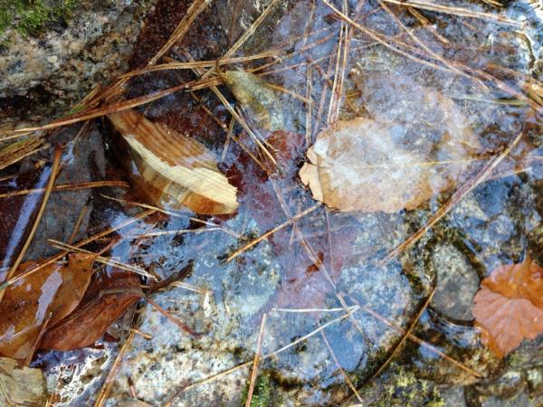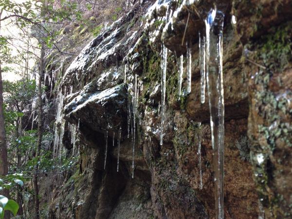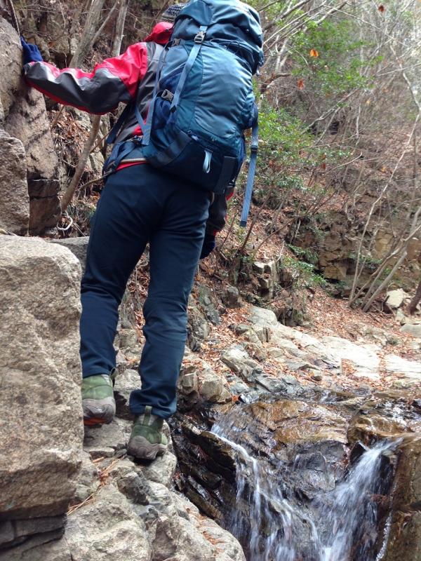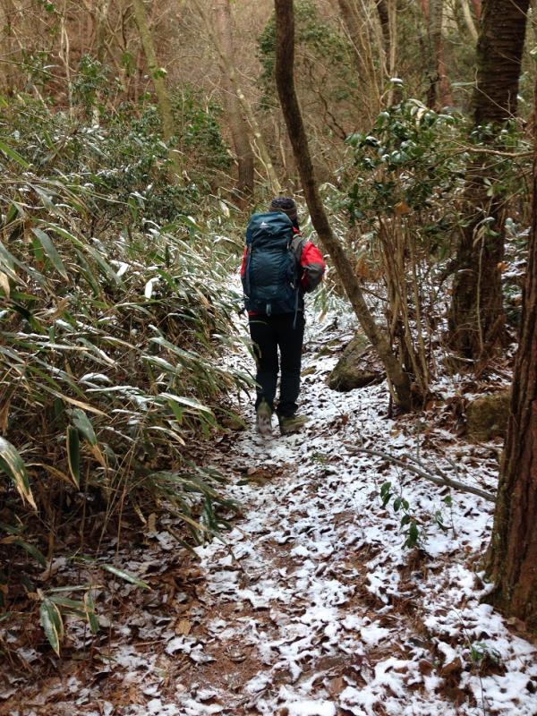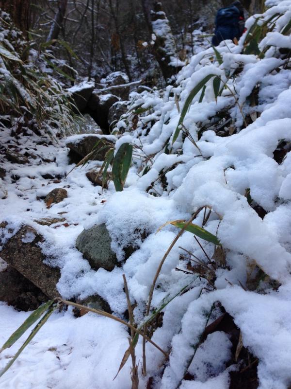 - 西尾根との分岐点までは落葉の道で歩きにくいところはありません。、途中の大堰堤を越えてからは雪と氷が出てきます。沢筋の登山道なので、何回も横切りますが、岩が凍っている所もあり、注意が必要です。裏六甲は12月以降、使わなくてもアイゼンを用意しておきましょう。