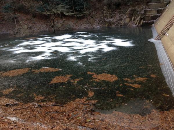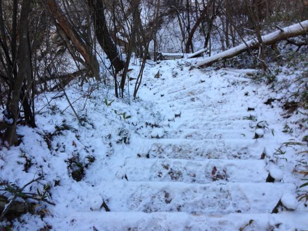 2013年の登り納めに六甲山でした。前日が平地でも小雪舞う天気でしたので、下の方から積もっているかなと思いましたが、日陰に雪が残っている位で、登山道はカラカラに乾いており、歩きやすく快調に歩けました。大池地獄谷は斜度のきつい所はほとんどないですが、沢沿いの道なので、沢を横切る回数が多く、特に冬期は注意が必要です。途中の大堰堤から上は別世界で、登山道はほぼ雪で覆われており、沢筋は凍っています。登りはましですが、下りに使う場合は滑ってかなり危険です。アイゼンは必ず用意しておきましょう。