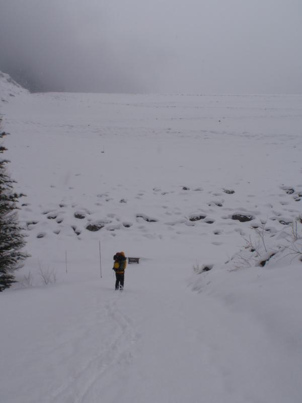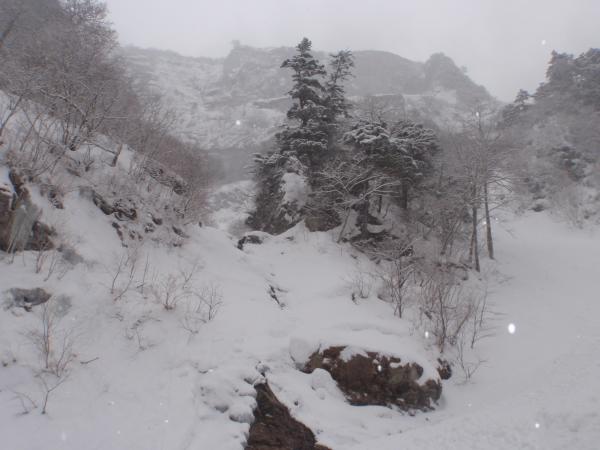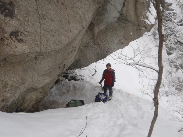 アプローチの沢も雪で埋まり、夏と比べれば快適そのもの。