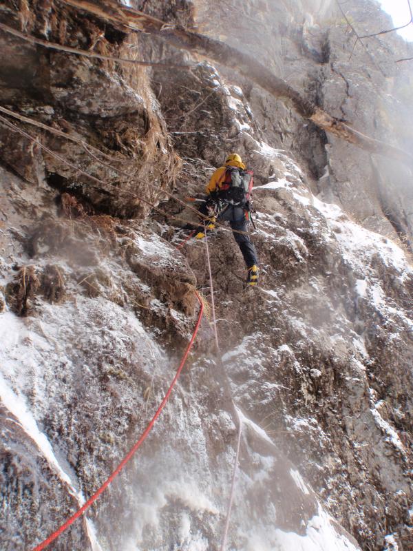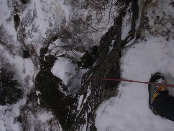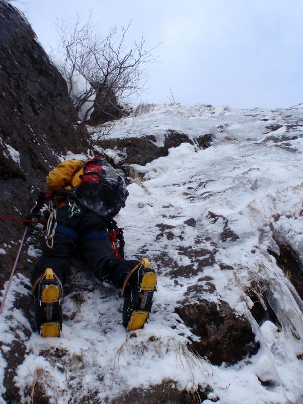 3ピッチ目 40m。ボサテラスには行かず、チリ雪崩を受けながら氷の繋がったスラブを直上。傾斜の強い凹状の岩場を越え、雪の詰まったルンゼをつめる。