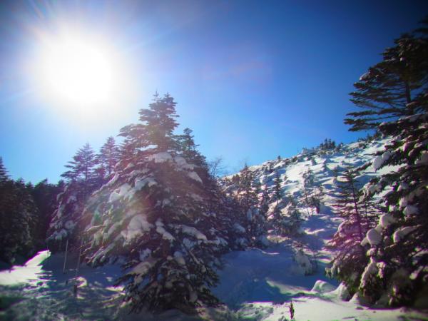- 雪が思っていたより積もっていました。黒百合ヒュッテまでならチェーンアイゼンでも行けますが、それ以上進む場合は10本以上のアイゼン必須。