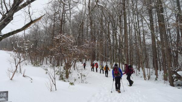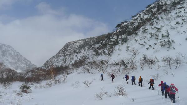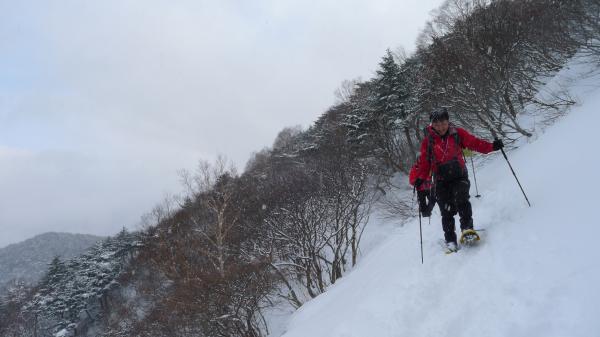 くろがね小屋付近のトラバースでスノーシューは滑って歩きにくそうでした。
