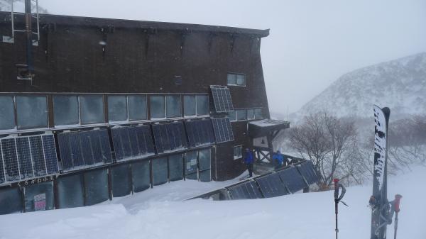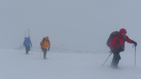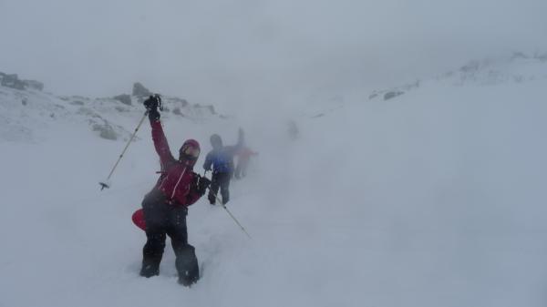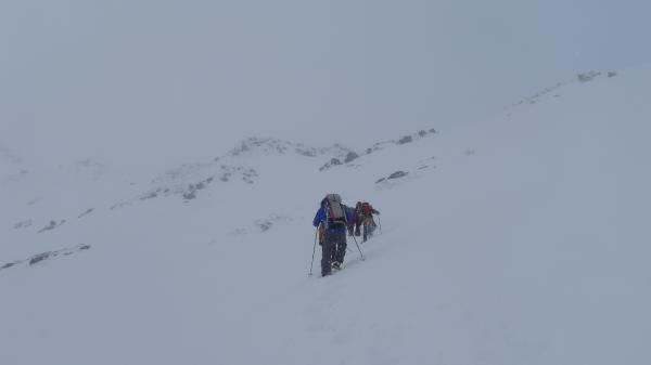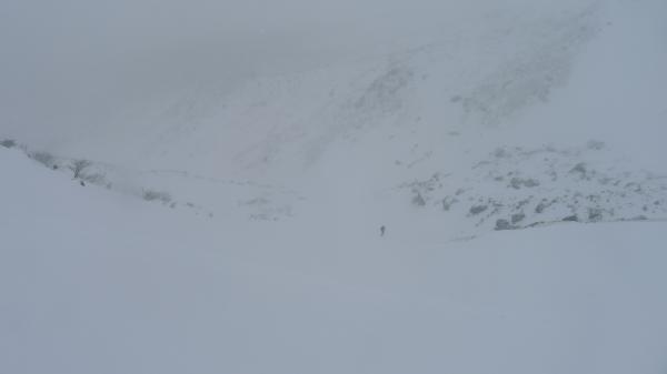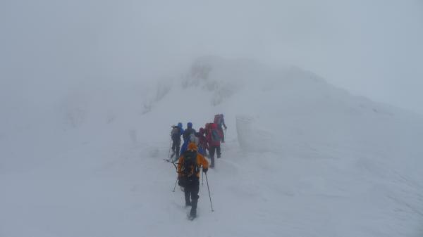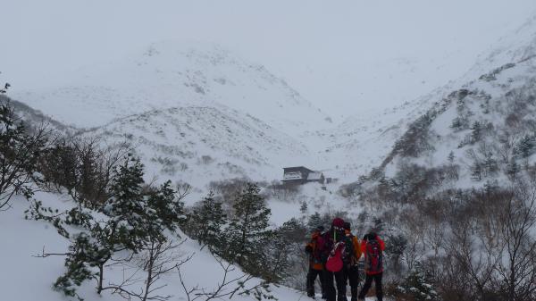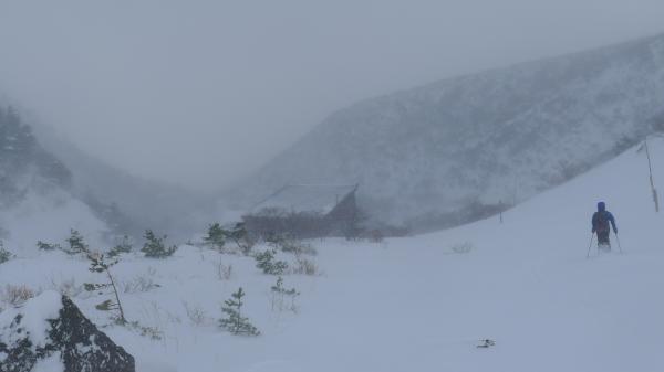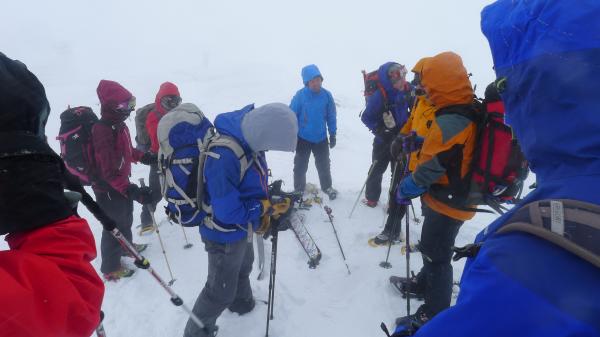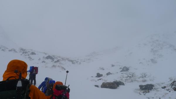 2日目は稜線に出ましたが強風でとても寒く、またスキーヤーもいたので、山頂はお預けになりました。