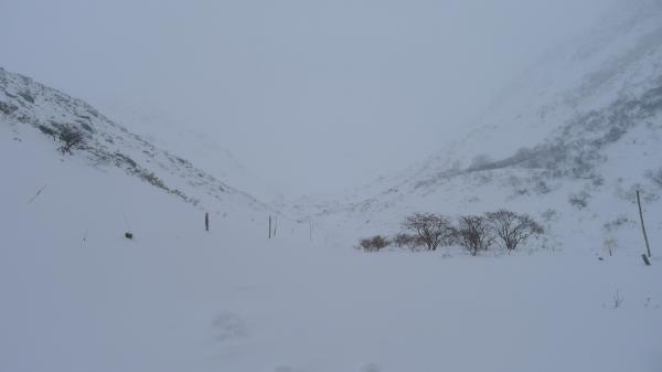 降雪のためラッセル。トレースも強風のためすぐ消えます。