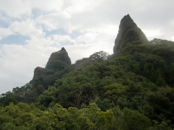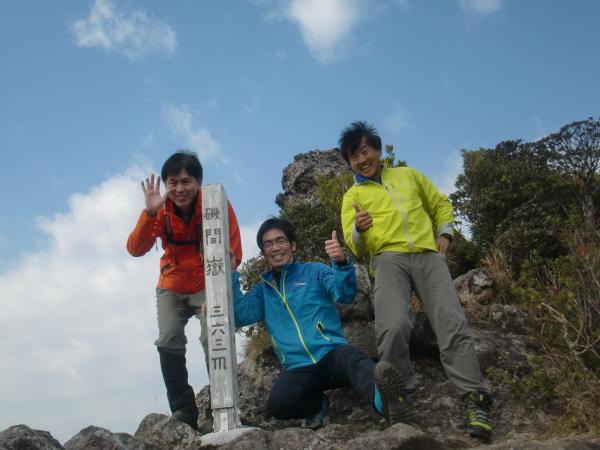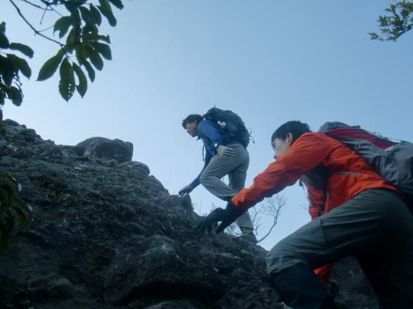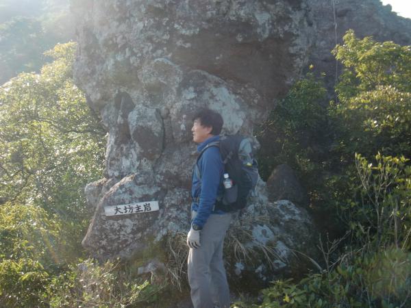 - 岩稜コース林道入口==(10分)==岩稜コース登山口==(15分)==大坊主岩==(10分)==オットセイ岩==(40分)==325ピーク==(20分)==林道跡出合==(45分)==中嶽==(15分)==ワン子岩==(50分)==山頂直下==(10分)==磯間岳山頂==(45分)==登山口==(20分)==岩稜コース林道入口