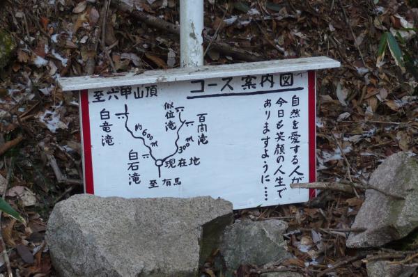 - 有馬・紅葉谷コース(50分)白石谷分岐(10分)白石滝百閒滝分岐(15分)百閒滝(10分)似位滝