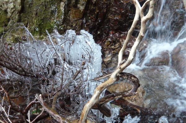 まだまだでした。しかし、飛沫が掛かる枯れ枝や石は、しっかり凍っています。