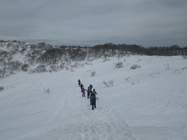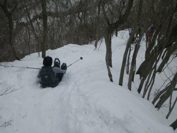 下山では、粗目の雪質でスノーシューのクランポンも噛みにくかった為か転倒者が続出しましたが、逆手に取ったシリセードには非常に楽しそうにされており、一番印象に残っています。